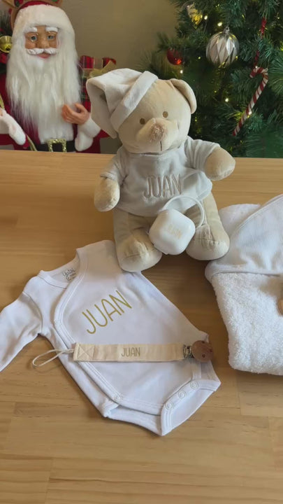 Incluye manta + doudou + capa de baño + chupetero + correa de tela + peine y cepillo + 3 muselinas + cesta.