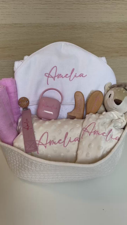 Incluye manta + doudou + capa de baño + chupetero + correa de tela + peine y cepillo + 3 muselinas + cesta.